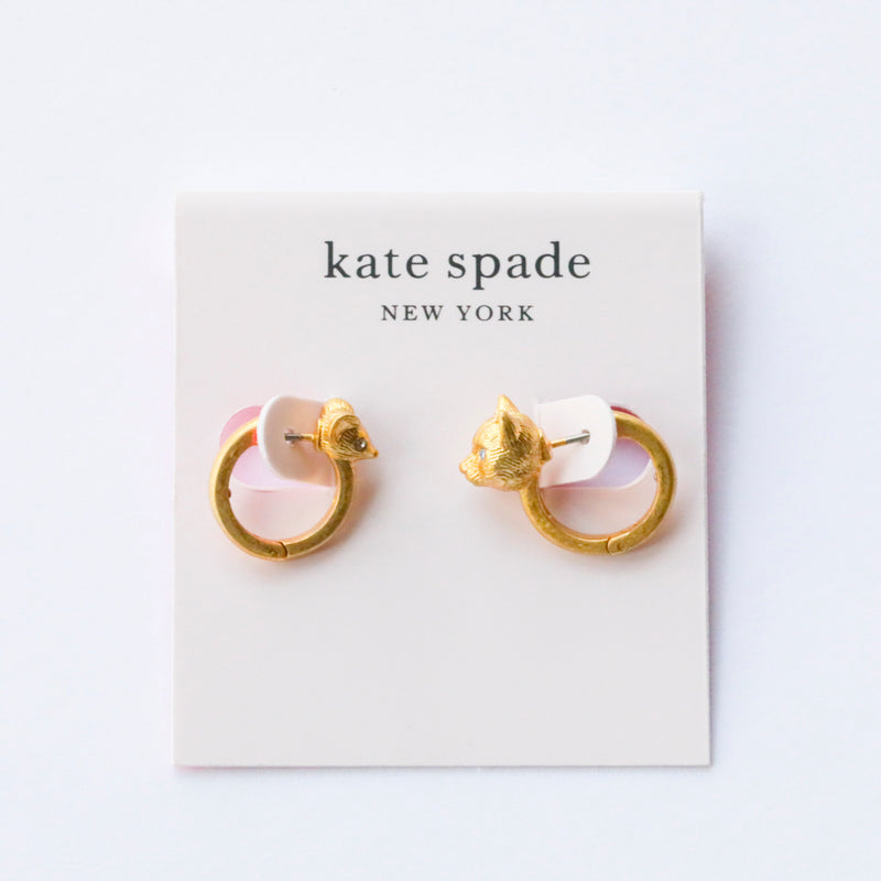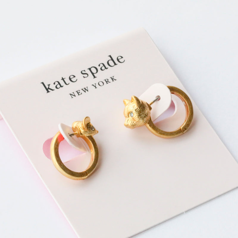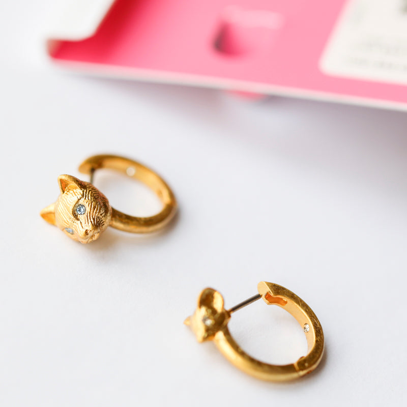 our house cat huggies are handcrafted of plated metal that shines extra beautifully when it catches light. we added a textured feline and mouse face to the tops for a clever finishing touch. mix them with other studs or allow them to make a statement all on their own.