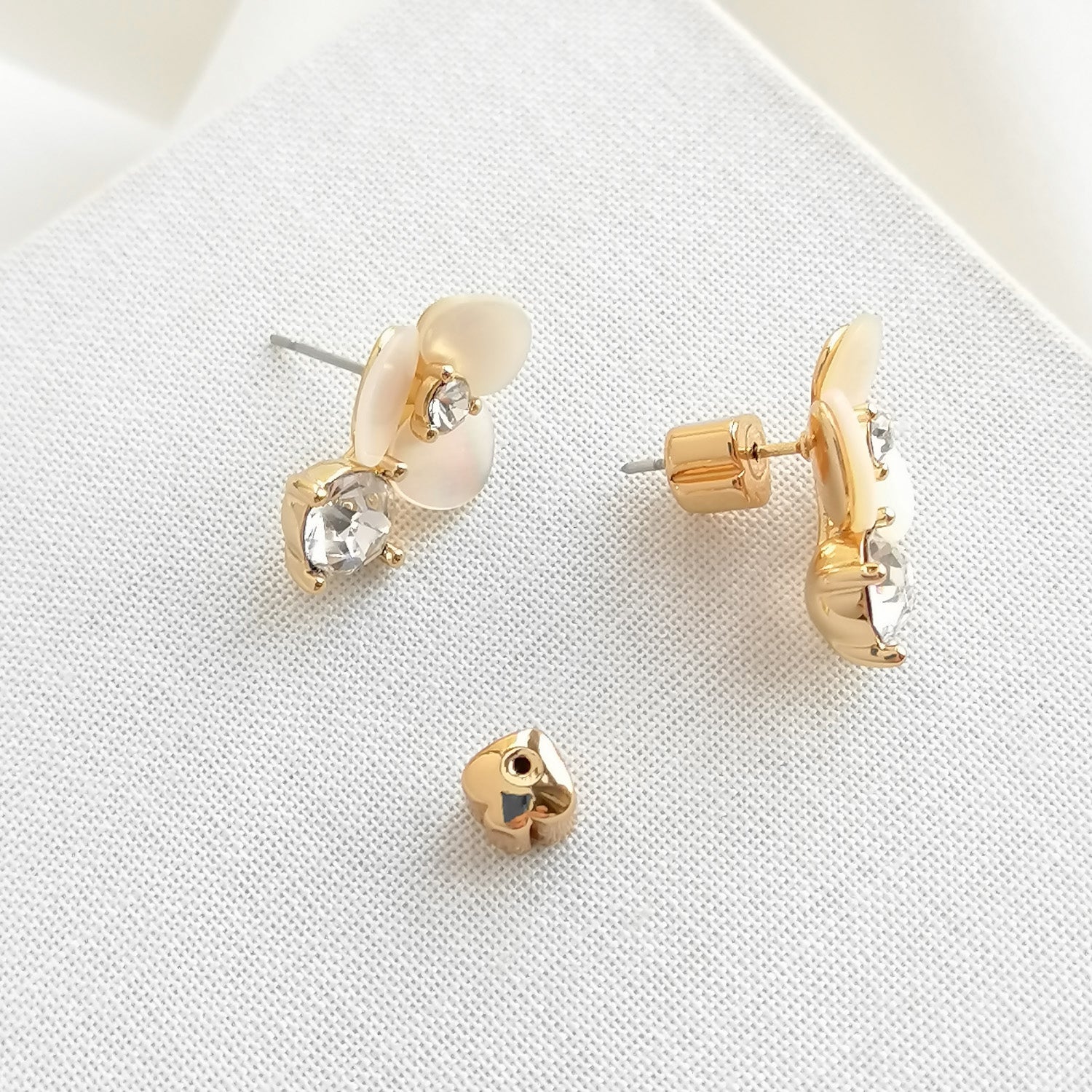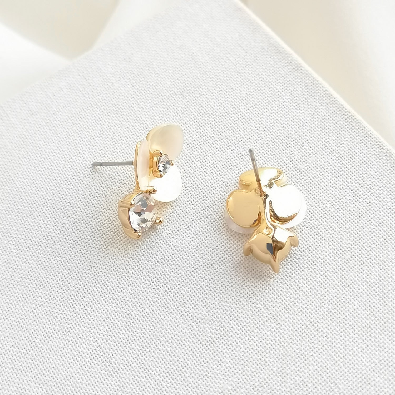 These delicate and contemporary floral studs are centered with light-catching crystals and trimmed with luminous mother-of-pearl discs.