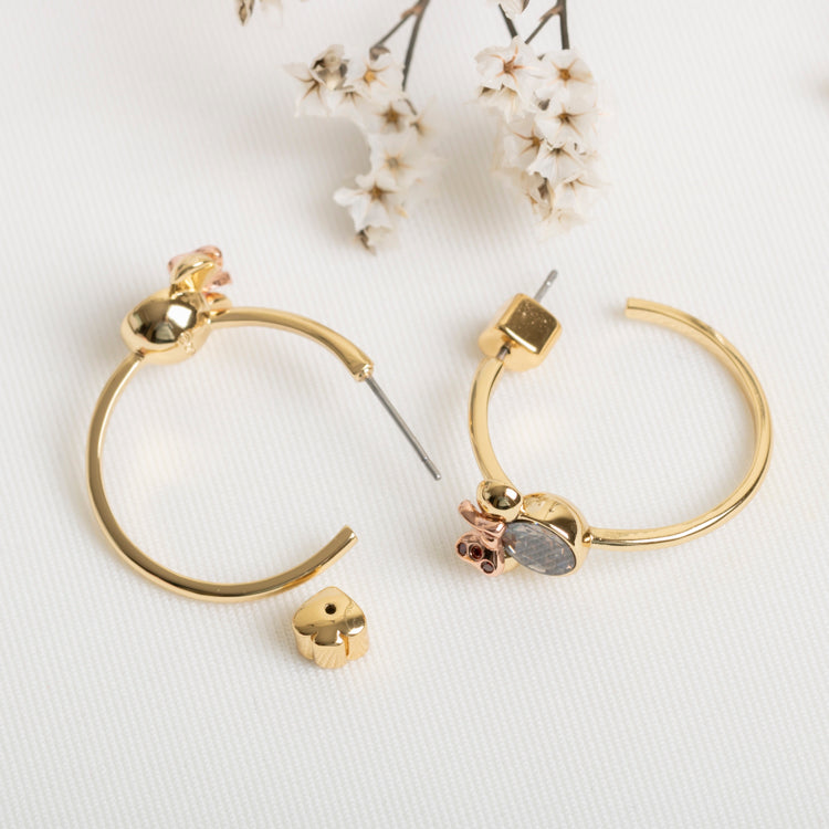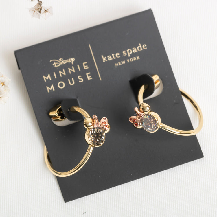 a new collaboration in our friendship with disney, these gold-plated hoops are decorated with faceted gems and a rose gold-tone bow in the unmistakable motif of our favorite movie mouse. we added spade-shaped backs for a clever finishing touch.