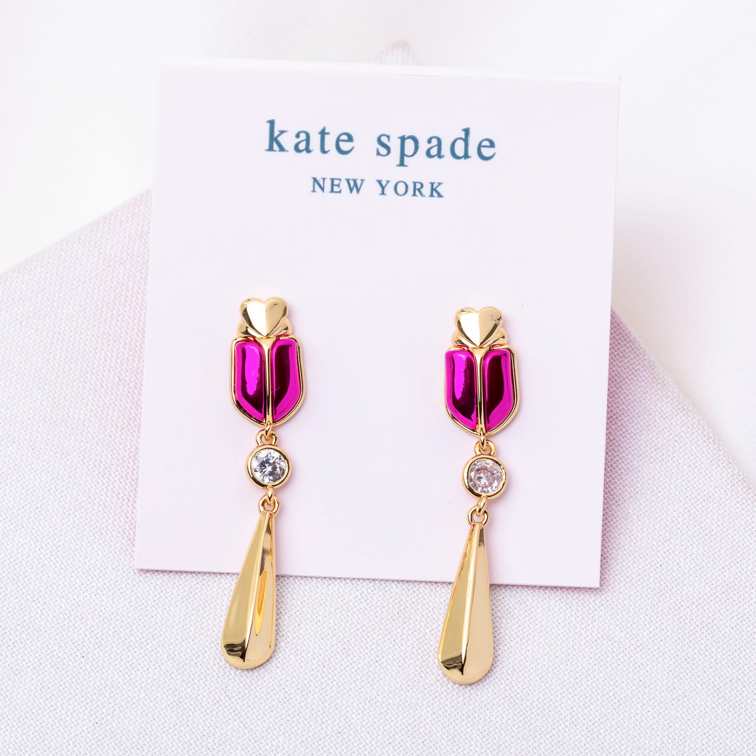 our love bug collection celebrates our insect friends. these glamorous linear earrings feature a plated and color-coated metal scarab (a symbol of transformation and protection since ancient egypt). those glistening jewels will have all eyes on you when they catch the light.