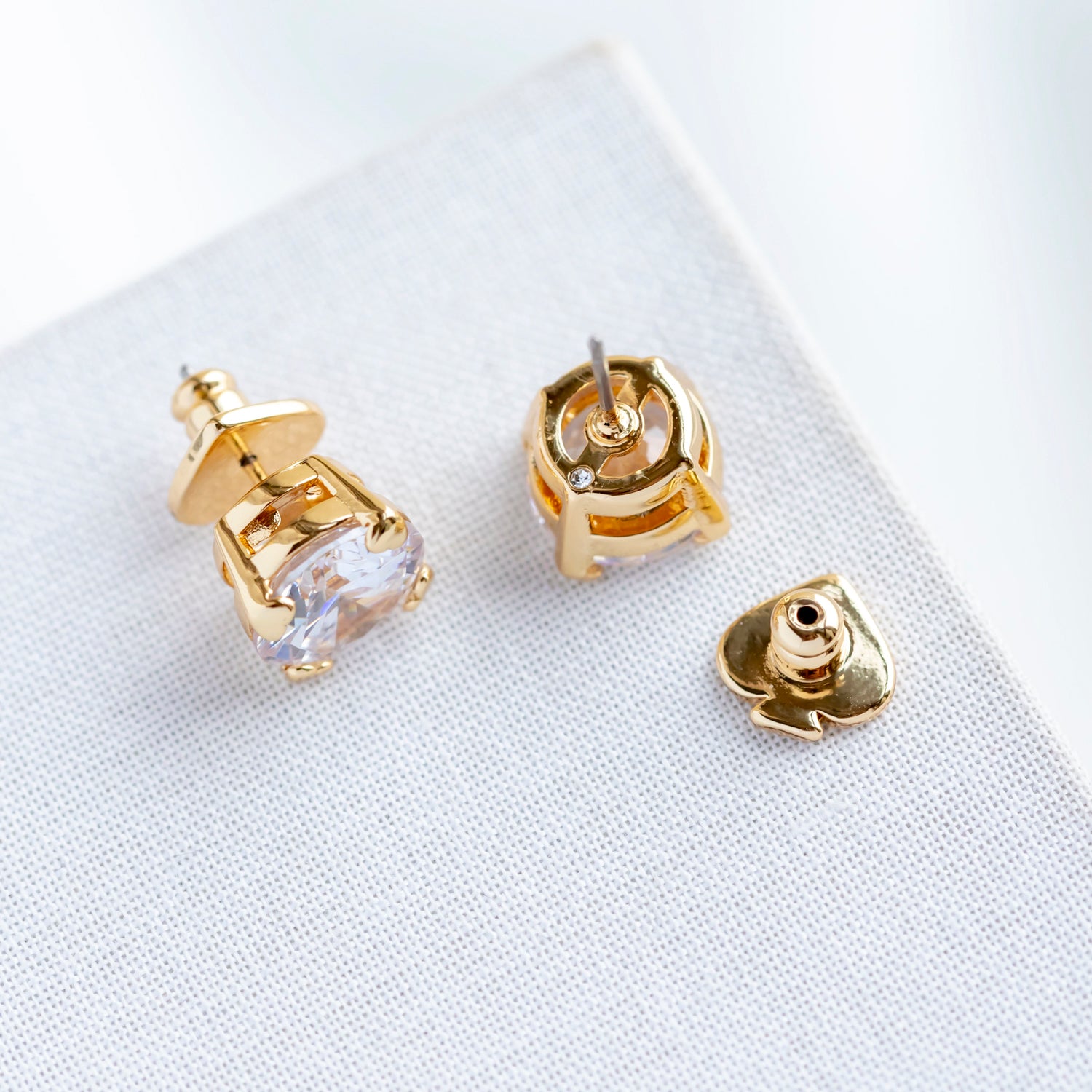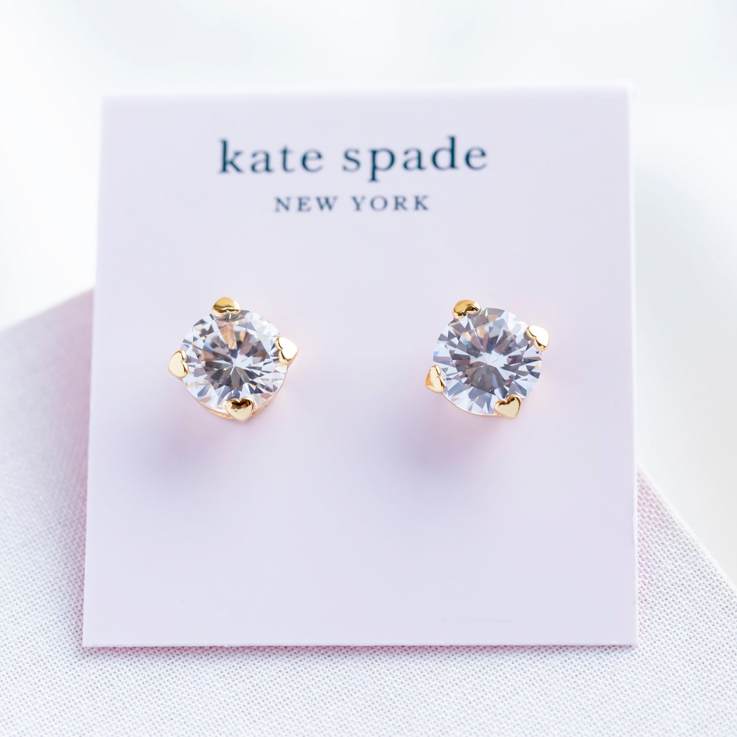 these sparkling earrings boast small crystals and are accented with mini golden hearts at the sides. love.