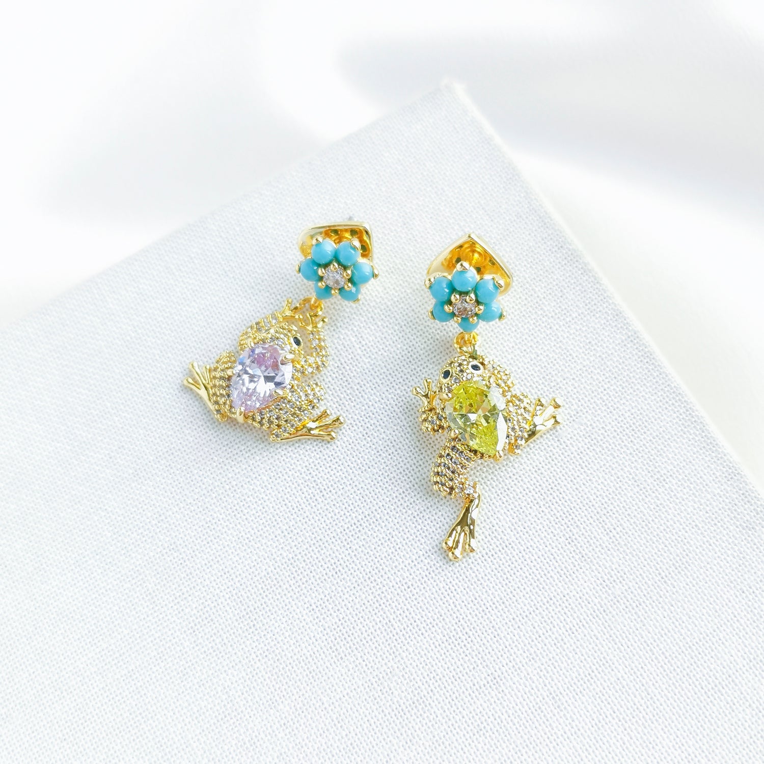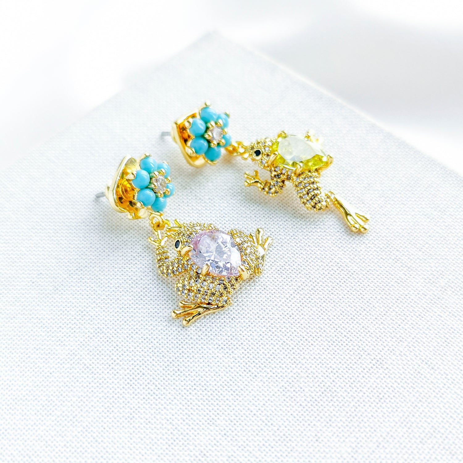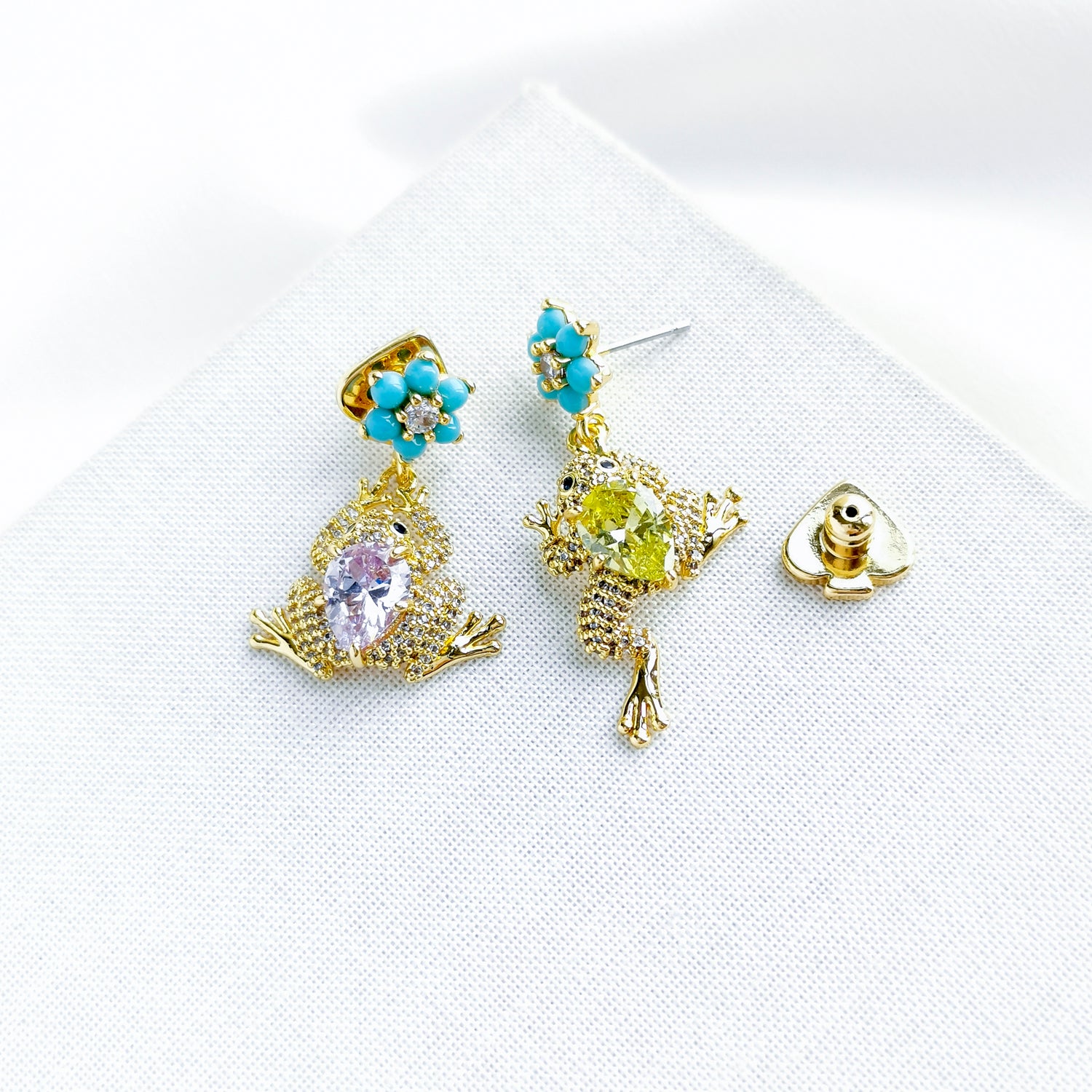 see the jeweled bodies, sparkly legs, those golden feet? these frog earrings are so pretty you could kiss them!